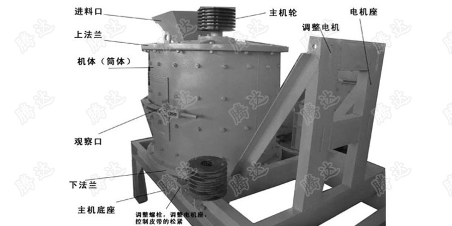物料由機器上部垂直落入高速旋轉的葉輪內,在高速離心力的作用下,與另一部分以傘狀形式分流在葉輪四周的物料產生高速撞擊與粉碎,物料在互相撞擊后,又會在葉輪和機殼之間以物料形成渦流多次的互相撞擊、摩擦而粉碎,從下部直通排出,形成閉路多次循環,由篩分設備控制達到所要求的成品粒度。